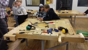 Para finalizar las sesiones docentes nos trasladamos a Koivusaaren Kuolu, donde hemos asistido a una clase de tecnología junto con los alumnos de 7º, viendo como trabajan la madera y los proyectos que hacen. Después hemos subido a la sala de profesores para hablar con ellos sobre la educación en estos ciclos superiores.